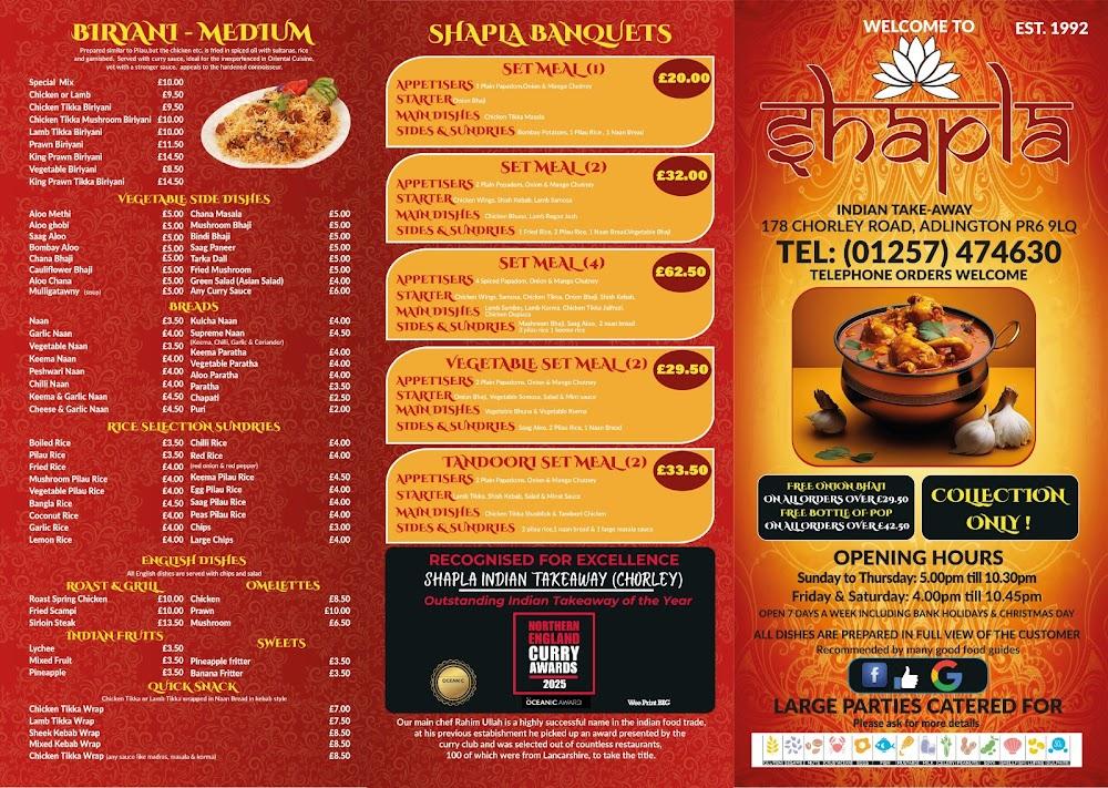 Tucked away on Chorley Road in Adlington, Shapla Indian Takeaway is not just a place for food; it embodies a rich history woven with local community spirit. For 34 years, this family business has been a staple of the village, drawing in locals and visitors alike craving genuine Indian cuisine. The layout is casual, making it perfect for family dinners or quick takeouts after a busy day. Accessibility is prioritized with a wheelchair-accessible entrance and ample parking. On a nearby street, you may even spot locals sharing their favorite dishes, creating a lively atmosphere. The restaurant welcomes reservations, making it convenient for large parties planning special gatherings. From the moment you step in, you feel the warm embrace of culture and tradition, ensuring every meal is more than just food—it's an experience to savor.